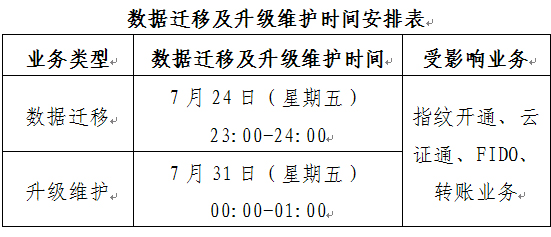 我行將于2020年7月24日(星期五)23:00-24:00、7月31日(星期五)00:00-01:00分別對掌易行云證通業(yè)務(wù)進(jìn)行數據遷移及升級維護工作,期間我行云證通及FIDO業(yè)務(wù)可能出現短暫中斷情況。待數據遷移及升級維護完成后各項業(yè)務(wù)恢復正常。
